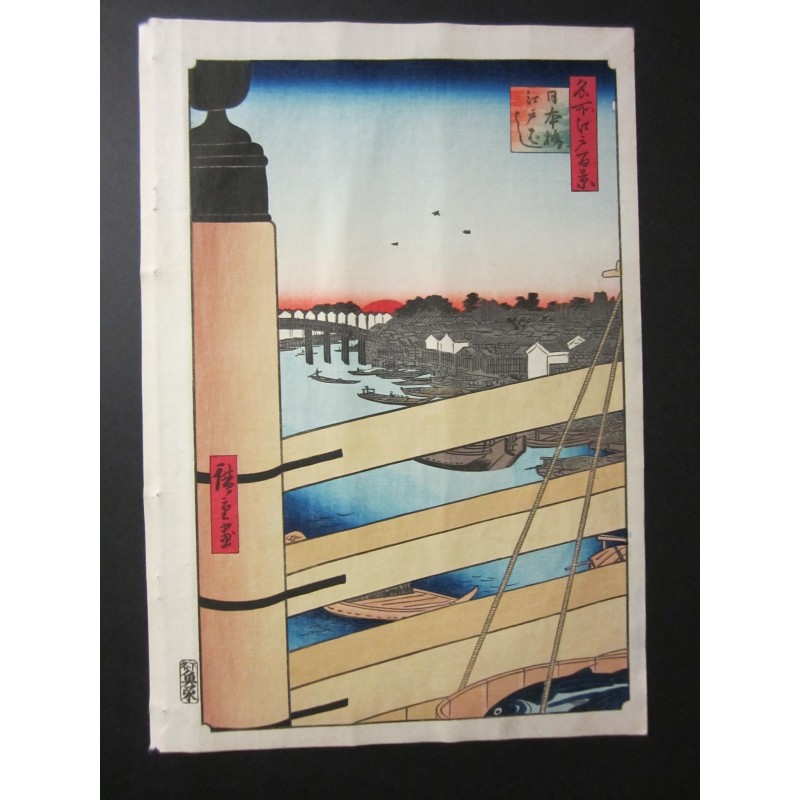 Une curieuse composition d'un paysage entrevu à travers les poutres du pont en gros plan, avec un grand pilier qui occupe tout le côté gauche et un panier de poissons (thon) tronqué sur la droite, porté par une personne qui ne figure pas dans l'image, située à la place du spectateur. Les planches sont celles du pont Nihonbashi (« pont du Japon » ou « pont du soleil levant »), alors que celui de l'arrière-plan est le Edobashi (« pont d’Edo »), situés sur la Nihonbashi-gawa. À l'horizon se lève le disque rouge du soleil.